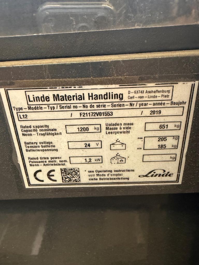 Hersteller: Linde Typ: L12 Bauart: Hochhubwagen Antriebsart: Elektro Tragkraft: 1200 kg Baujahr: 2019 Betriebsstunden: 1296 |